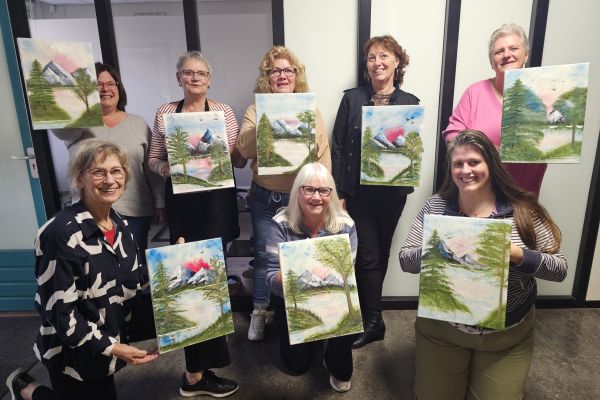Met onze gecertificeerde Bob Ross docenten Mariette en Freek maken jullie in één middag een prachtig landschap. Op jouw locatie of in ons atelier.